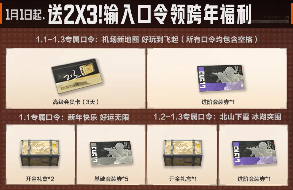 1月1日-1月3日专属口令:机场新地图 好玩到飞起可领取:高级会员卡(3天)、进阶套装券*1