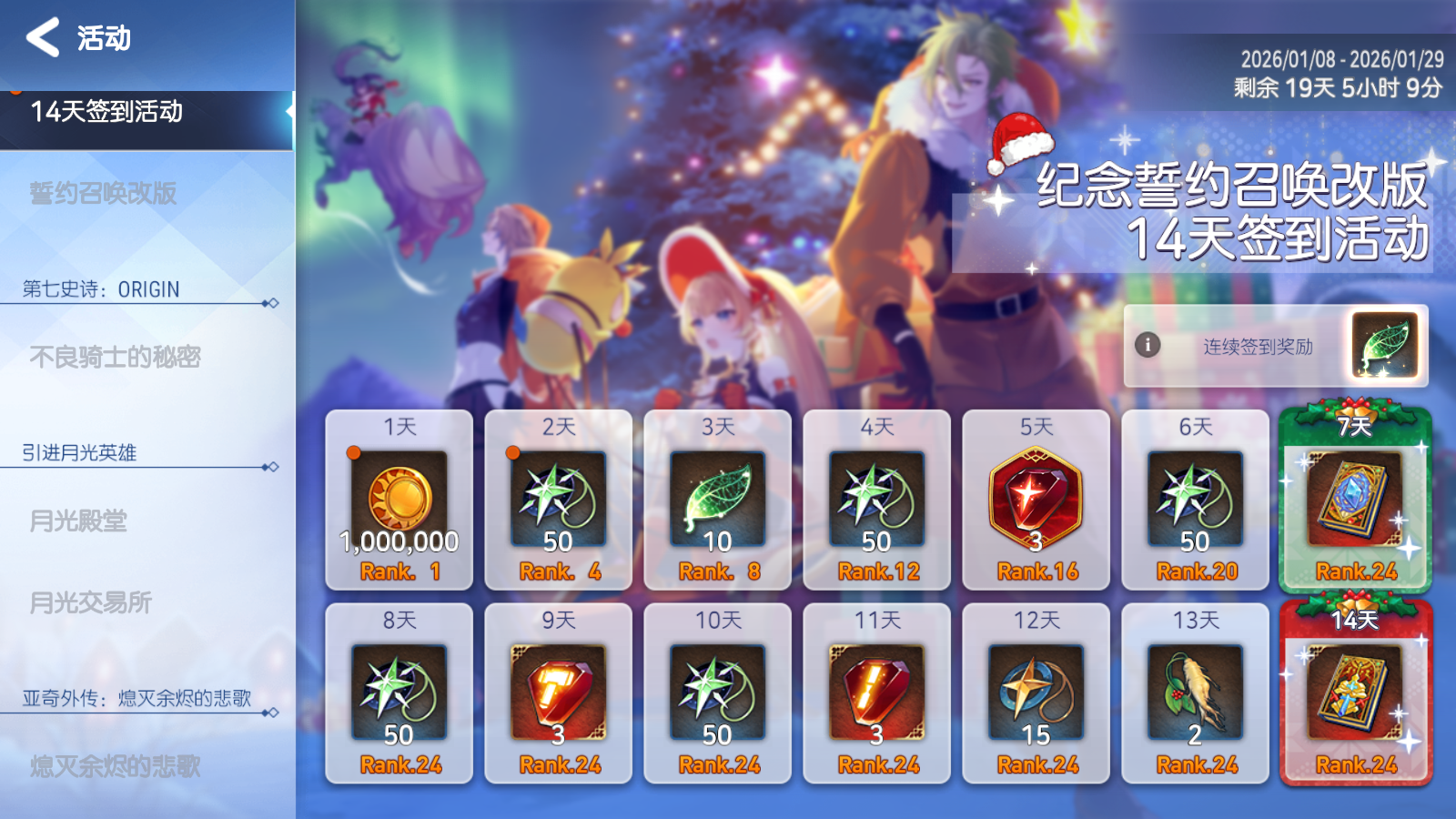 活动期间内,继承者通过进行每日签到,可获得5星英雄召唤券、5星神器召唤券、誓约书签、史诗书签、以及其他养成材料。