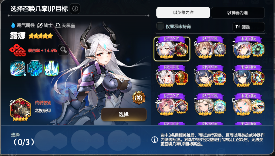 活动时间内,继承者可于卡池内选择3名英雄作为召唤几率UP目标,对选中的3名英雄进行1次以上召唤后,无法变更召唤几率UP中的目标英雄。