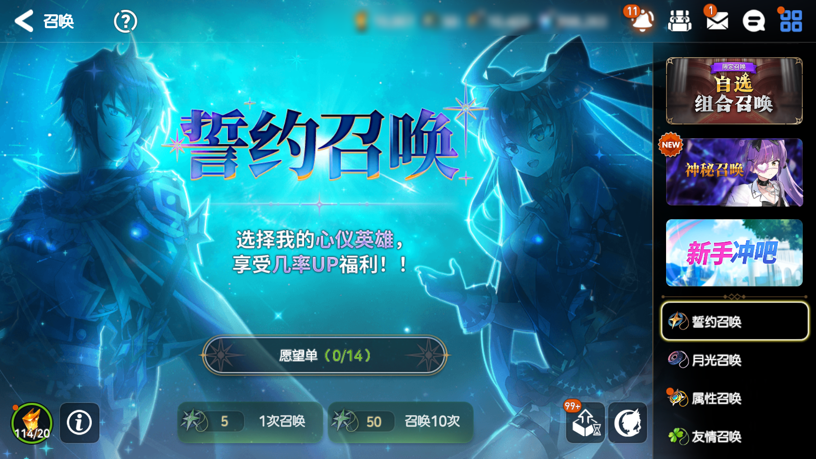 更新完成后,誓约召唤正式改版!继承者能够在卡池内,选择心仪英雄与神器,享受几率UP福利。