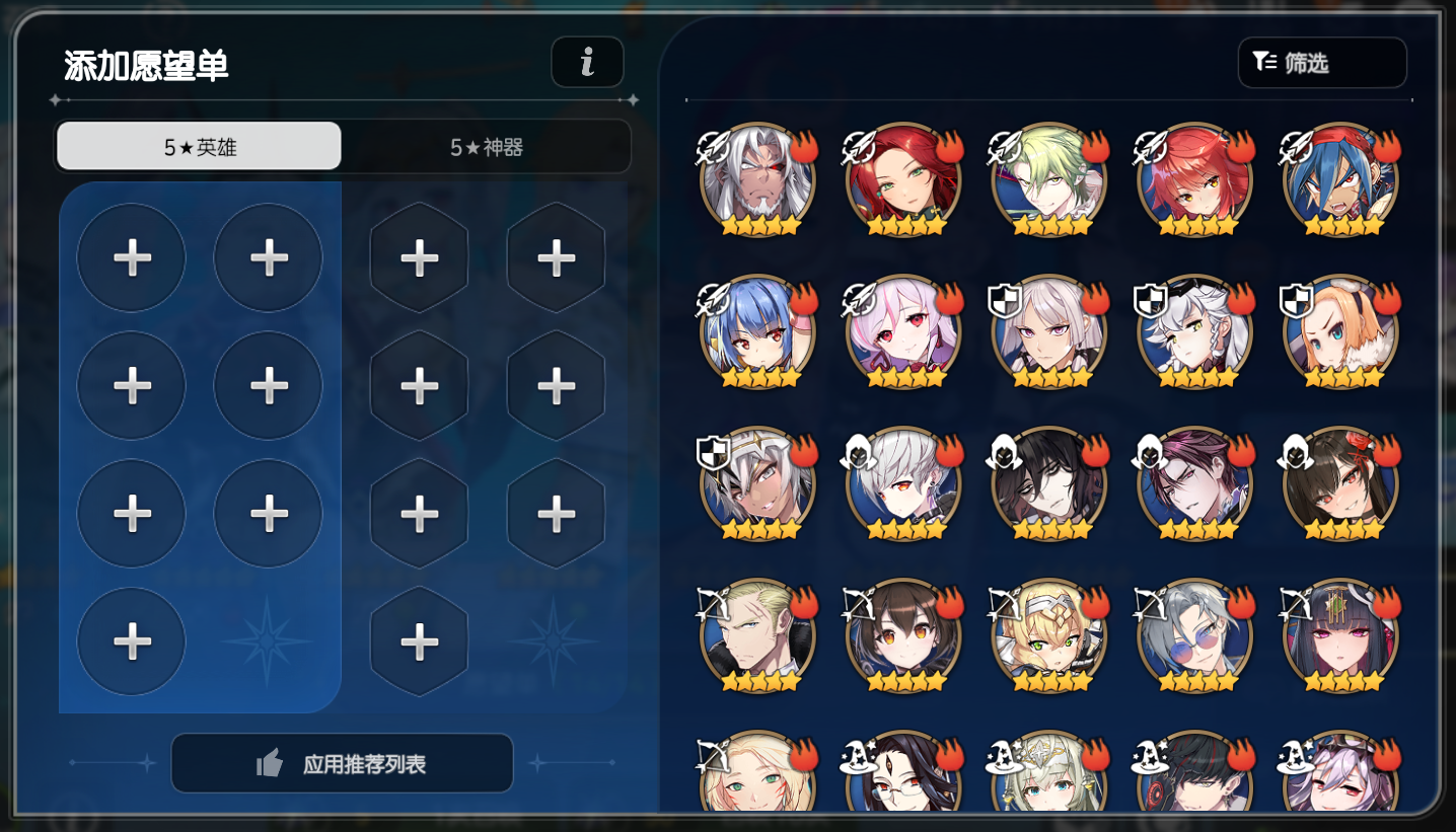 在誓约召唤中获得5星英雄或5星神器时,将获得已选愿望单中所添加的英雄与神器。5星英雄与5星神器的基本总召唤几率不变。