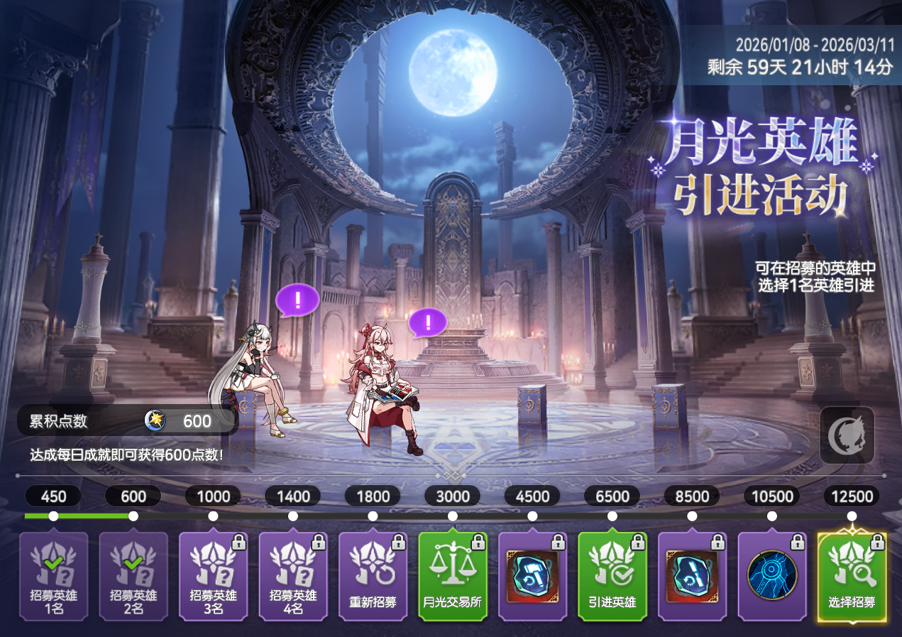 活动期间,继承者通过达成每日成就,即可获得点数,累积到对应点数时,开启相应功能,最终可在已招募的英雄中选择1名月光英雄引进。