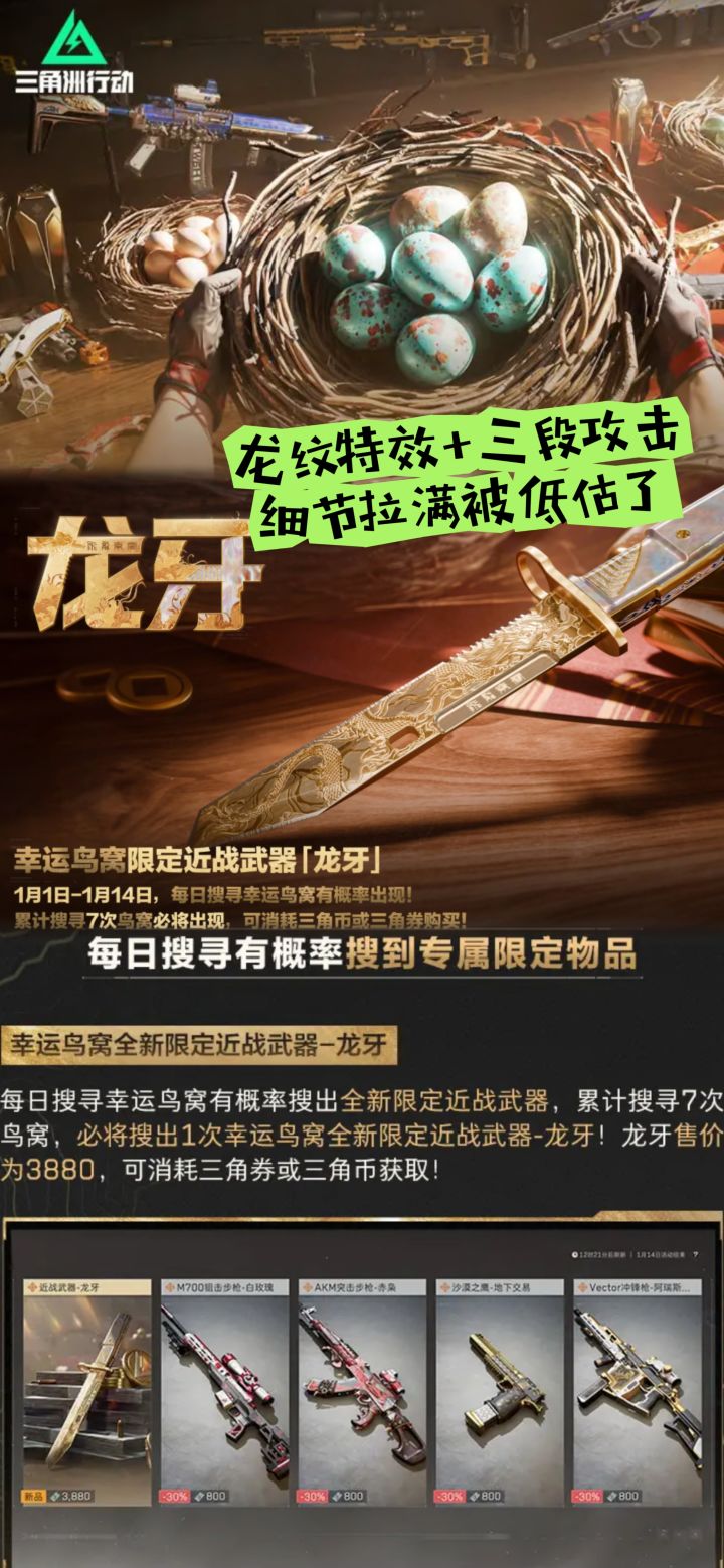 《三角洲行动》限定传说近战武器“龙牙”售价正式揭晓,定价3880三角券(约合388元),将于2026年1月1日至1月14日通过“幸运鸟窝”活动限时投放。