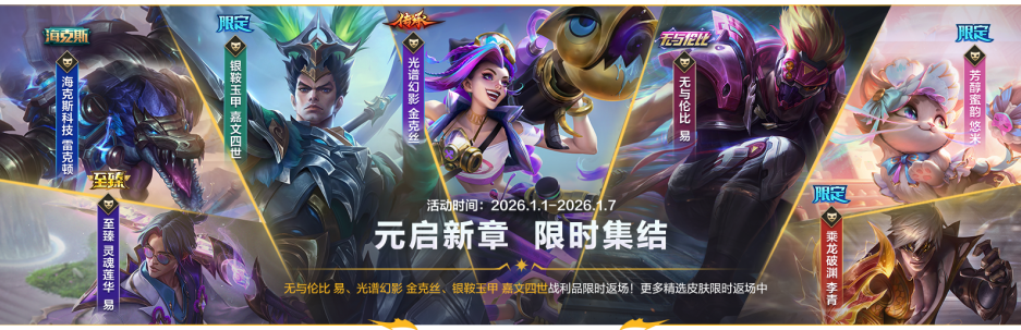 2026年1月1日(明日)-1月7日活动期间,无与伦比 易、光谱幻影 金克丝、银鞍玉甲 嘉文四世战利品限时返场!更多精选皮肤同步限时返场~