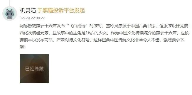 “飞白成诗”作为《燕云十六声》周年庆限定外观之一,上线后迅速引发玩家强烈反弹。多位玩家在黑猫投诉平台及社交媒体集中吐槽,认为该时装“服装设计展现出过多肌肤”“充满性暗示”,与其宣传的五代十国至宋代背景的“武侠国风”定位严重不符。