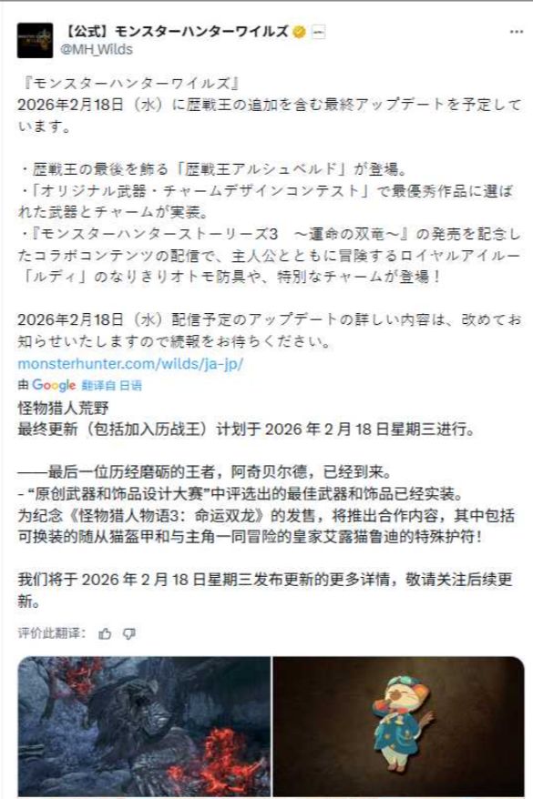 CAPCOM官宣《怪物猎人:荒野》将于2026年2月18日实装最终更新,为游戏后续内容支持画上句点。此次更新压轴内容为历战王锁刃龙,带来终极高难度挑战;同步实装玩家设计大赛获奖作品,落地玩家创意。另有《怪物猎人物语 3:命运双龙》联动内容,含皇家艾路 “卢迪” 的随从防具与特别饰物。此次更新标志着2025年12月16日追加 “巨戟龙” 后的主要更新周期圆满收官。