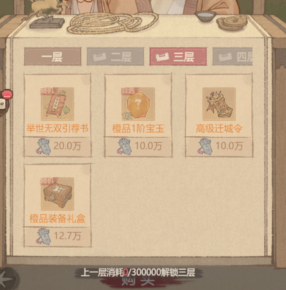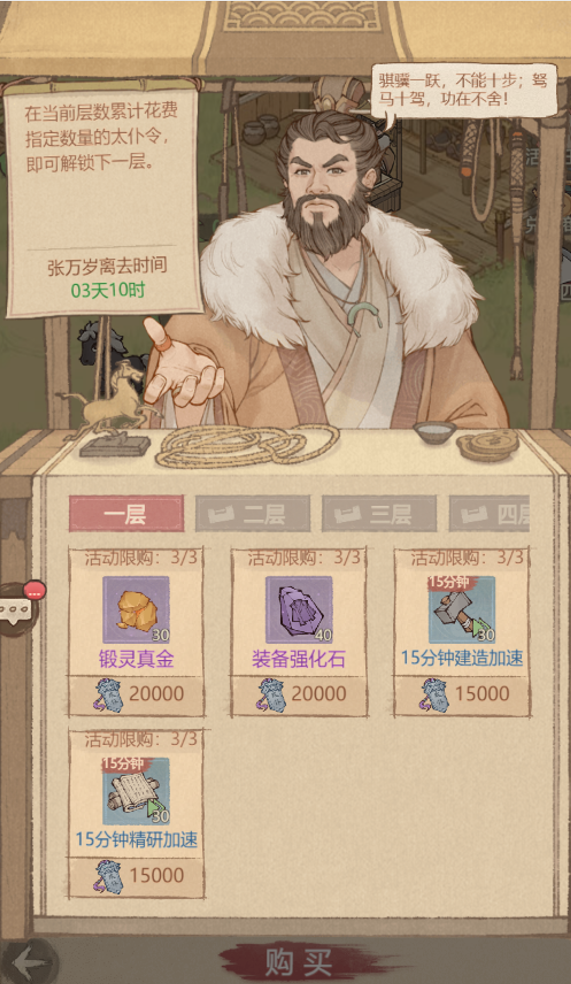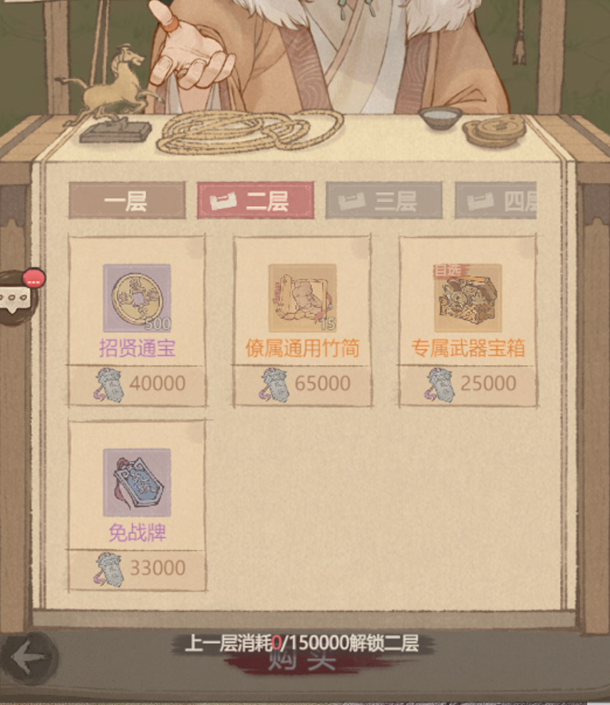 牌子攒够之后,我们就可以兑换资源强化我们的僚属了。兑换的东西简单说一下,第一层肯定是换强化石和橙石头。添两个加速快速解锁第二层