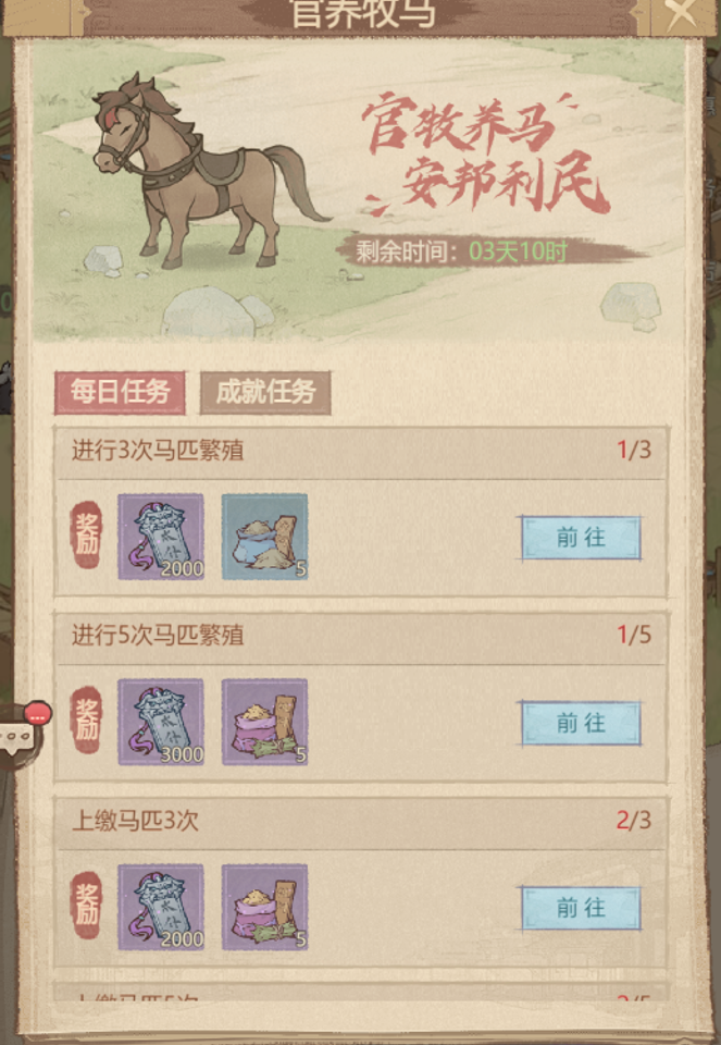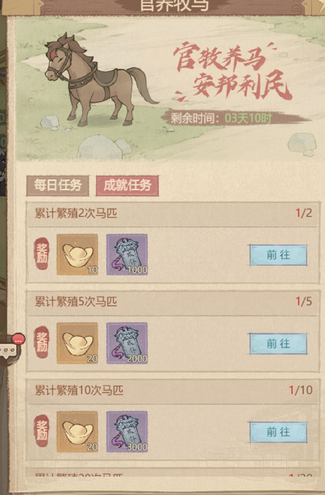 然后最快速度繁殖出两匹以上橙马。在繁殖过程中顺带完成每日任务,任务会奖励加速,加快我们出橙马的速度