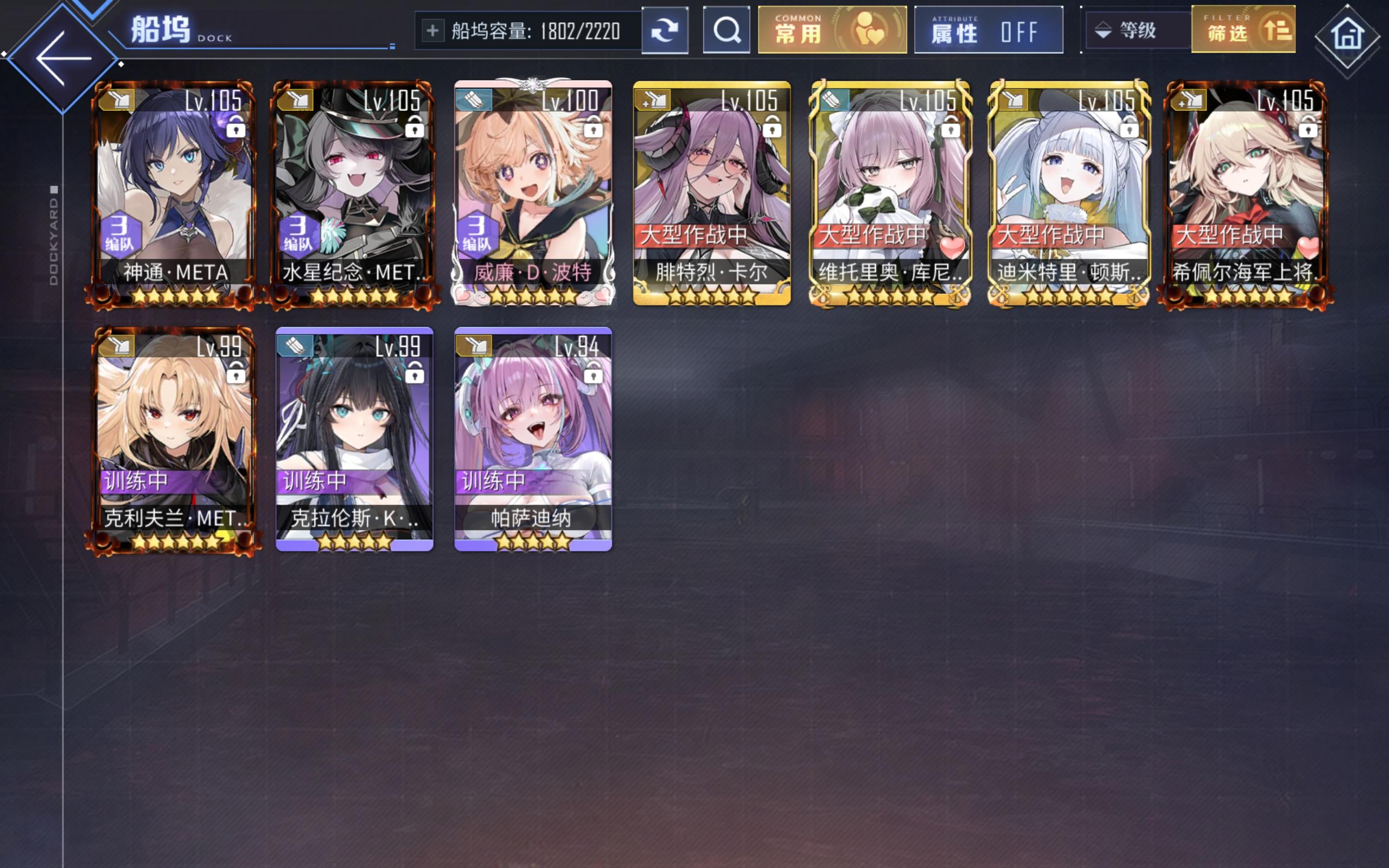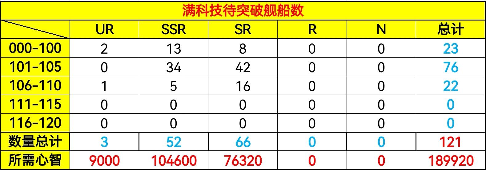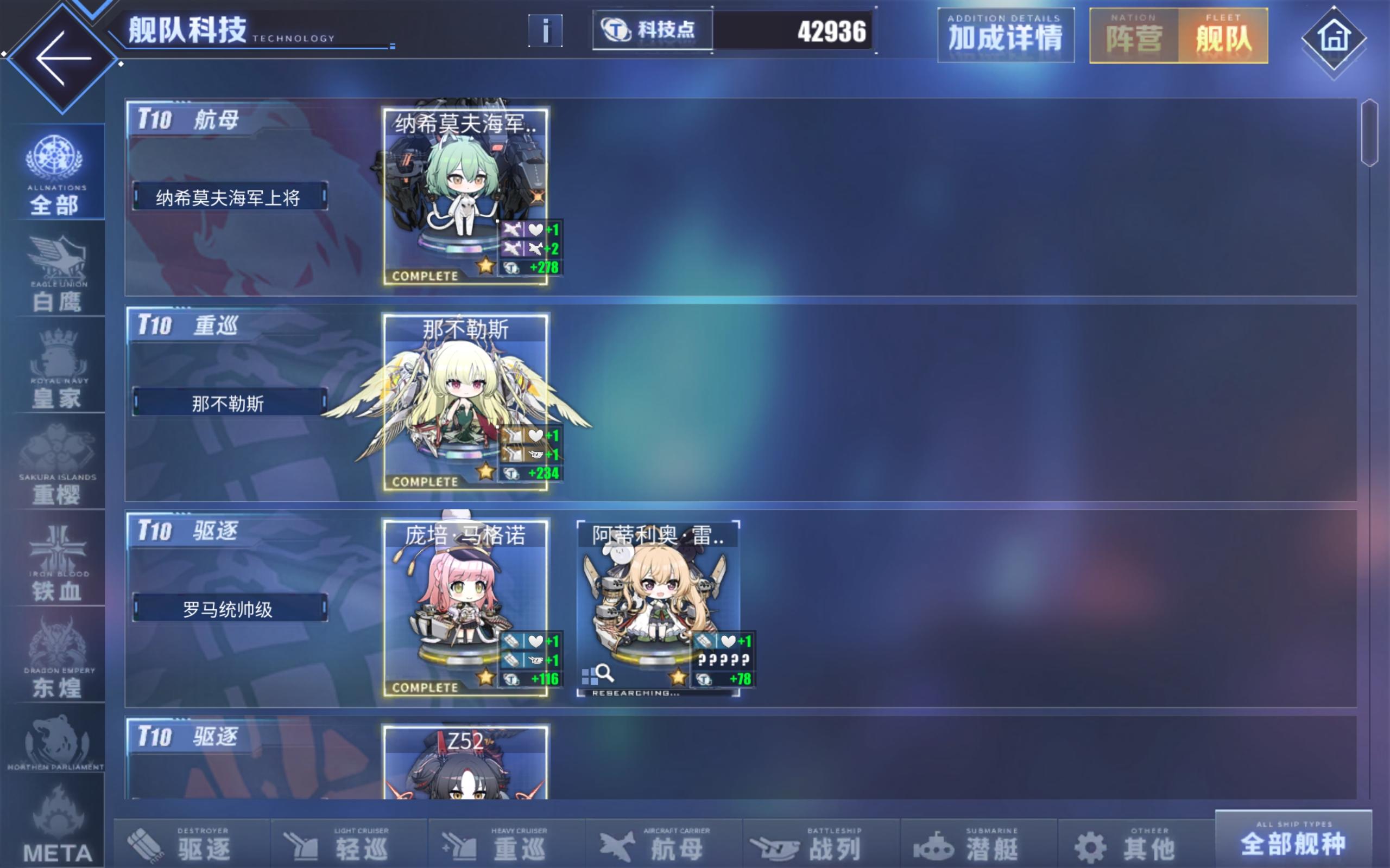剩余未刷满120级经验的科技点舰船有:前排10艘,;后排4艘,其中圣哈辛托未获取;潜艇5艘。