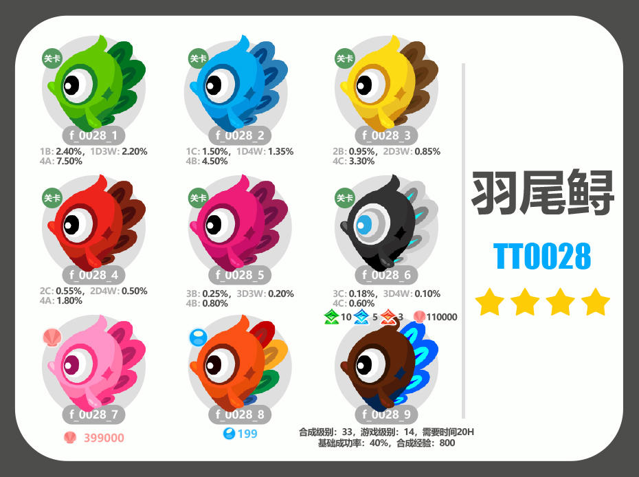 羽尾鲟是团团族4星鱼,一共9种颜色,其中前6色出处在关卡,第7色是贝壳,第8色是珍珠,第9色是合成鱼。活动时间为2026年1月1日至1月16日,更新时间为2026年1月1日中午1点左右,更新后会重置捉鱼次数。