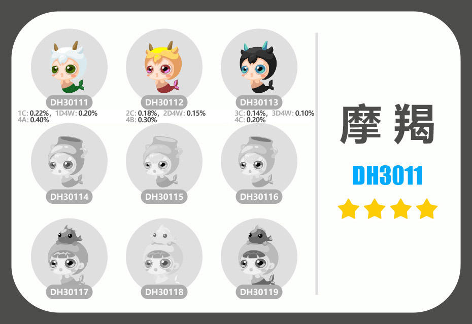 概率:绿25%,蓝25%,黄15%,红15%,紫10%,特殊色一5%,特殊色二5%