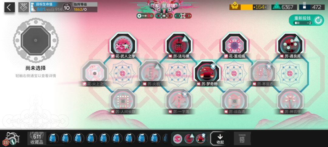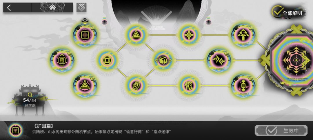 然后检查自己的科技树是否开启《扩园篇》,未开启则可无视后续对于战斗要求,考虑凹14血老戏骨全漏开局;如果开启,那就对干员素质有要求,即一层必须有能力打过两战不死;其它节点要求全部开启,特别是+攻击、+目标生命和+初始票券