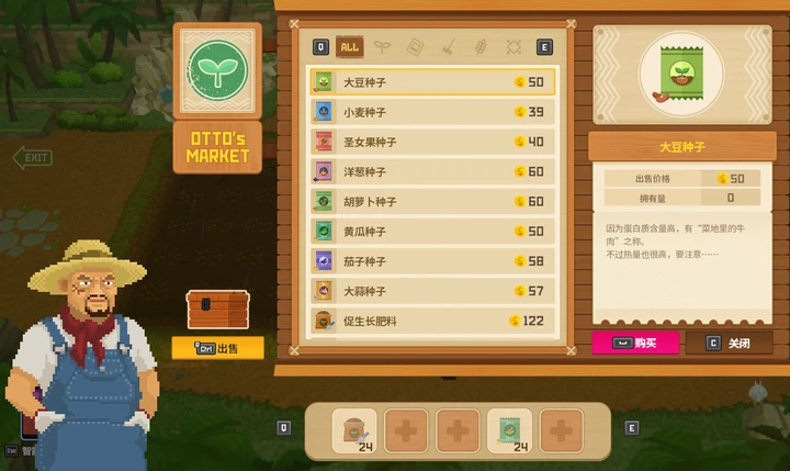 商店总共会解锁8种种子,推荐前期优先种小麦和大蒜,后期可以再补着种些黄瓜和大豆,用以咖喱派对和黄瓜派对