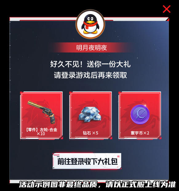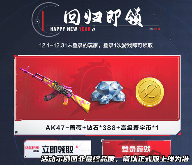 12月未登录的玩家登录一次游戏后,可到宝库的回归专属界面领取AK47-蔷薇、钻石x388、高级寰宇币x1。