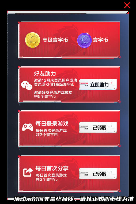 每日登录游戏和每日首次分享均可获得寰宇币。邀请12月未登录的用户成功登录游戏可获得高级寰宇币x1,邀请好友登录游戏成功可获得寰宇币x5。