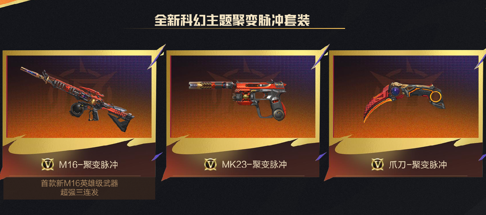 这也意味着全新科幻主题聚变脉冲套装即将来袭,主武器为M16-聚变脉冲,这是首款新M16英雄级武器,超强的三连发不会让你失望;该套装的副武器和近战武器分别是MK23-聚变脉冲和爪刀-聚变脉冲,都是比较强力的武器哦。