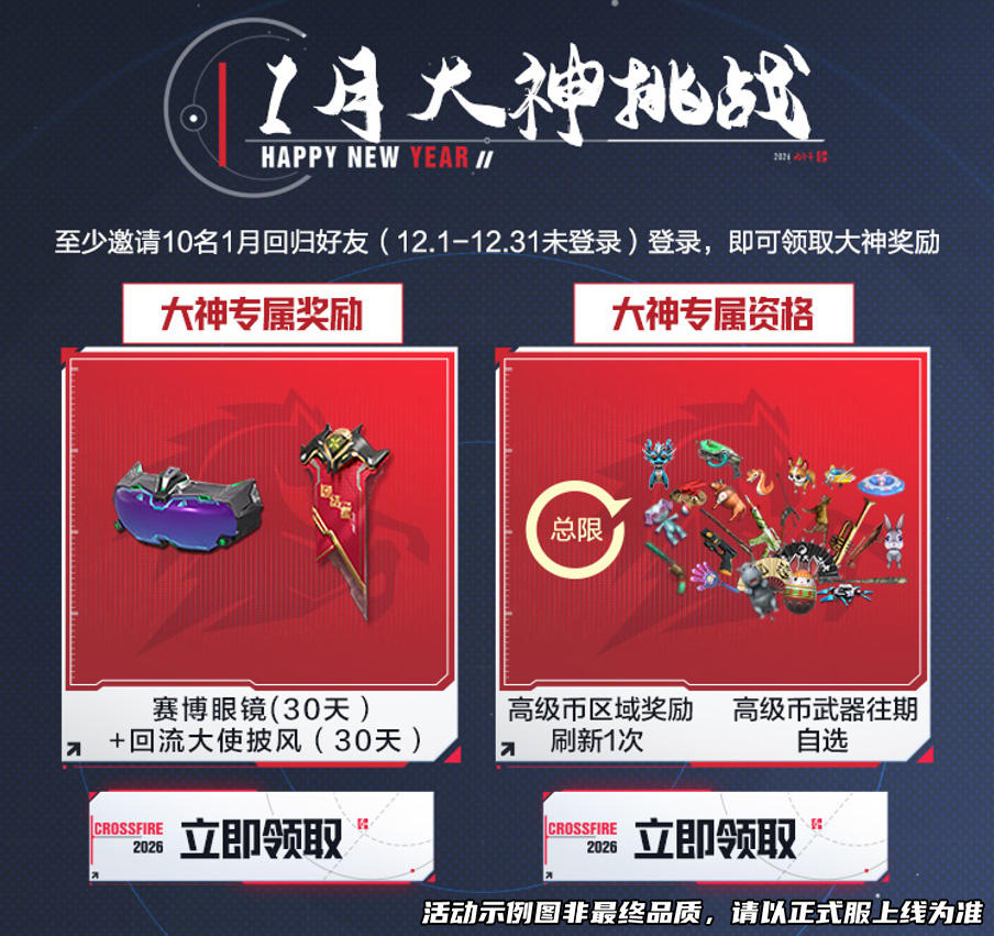 最后来看到大神挑战板块,只要成功邀请至少10名12月未登录的回归好友,就能解锁大神专属奖励:赛博眼镜(30天)与回流大使披风(30天),还能获得大神专属资格,高级币区域奖励刷新一次,同时可自选一款高级币武器往期道具。