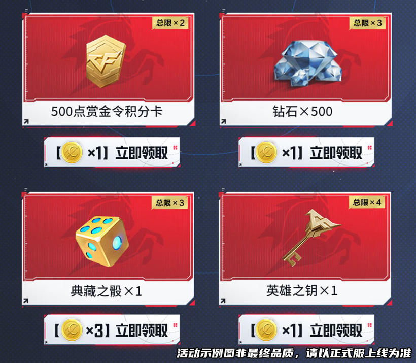 接着是超值加购区的一些常客,500点赏金令积分卡、500钻石、典藏之骰x1、英雄之钥x1等道具均可使用高级寰宇币兑换。所需寰宇币数量和兑换限制次数如下图所示: