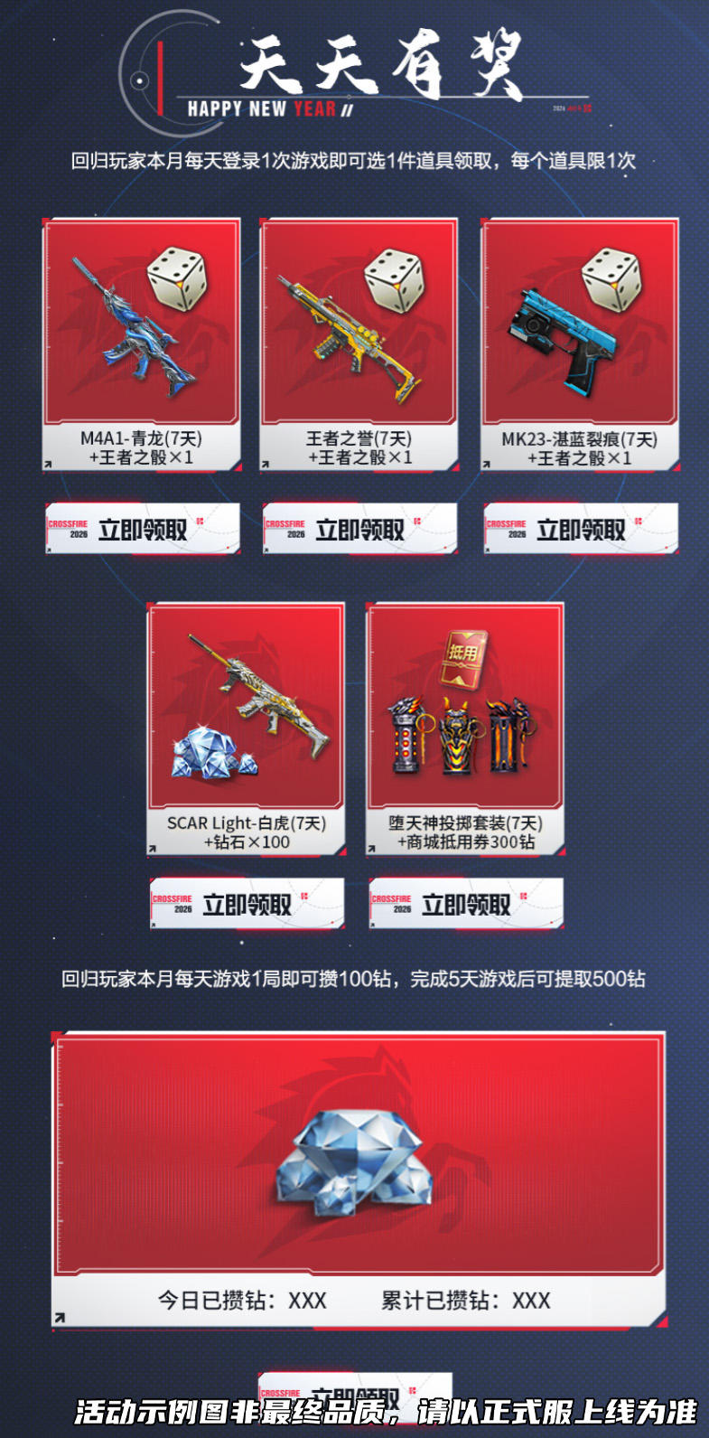 1月期间,回归玩家每天登录一次游戏,还可在宝库领取每日奖励,轻松领王者之骰和钻石,还可体验不少英雄级武器。不仅如此,回归玩家每天玩1局游戏还能攒100钻石,完成5天游戏后即可一次性领取500钻石。