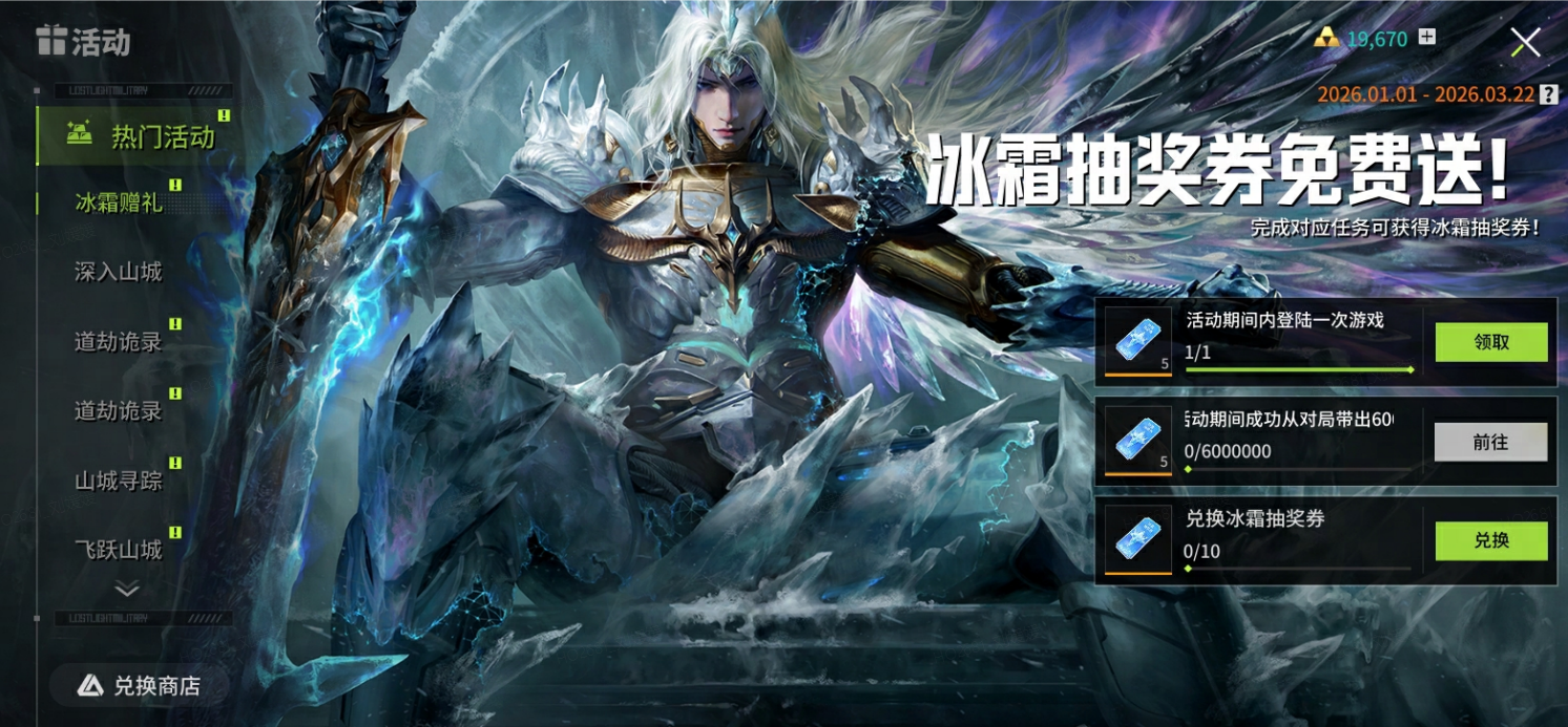 别忘了前往冰霜赠礼活动,登录即得冰霜领主奖池抽奖券*5,完成任务再拿下冰霜领主奖池抽奖券*5,还有奖券兑换任务,共计免费得10抽!领取再化身冰霜领主,解锁凛冬终极战力!