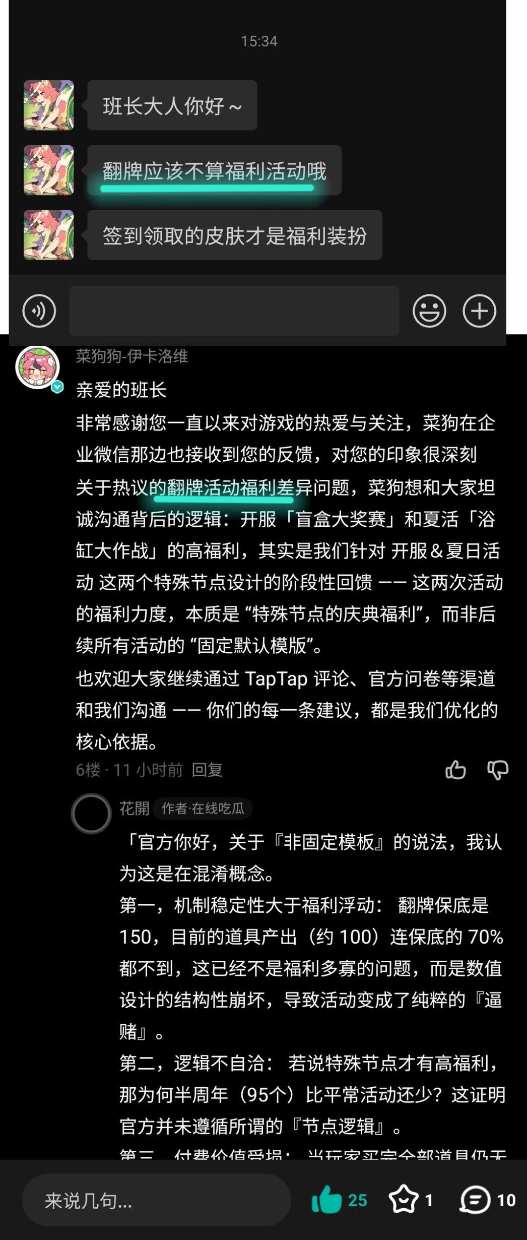 我的质疑: 这种像小孩子撒谎一样、前后矛盾的说辞,把玩家当成傻子吗?如果翻牌不算福利,那为什麽要放进夏活、半週年?如果它是福利,那为什麽道具产出连保底都摸不到?