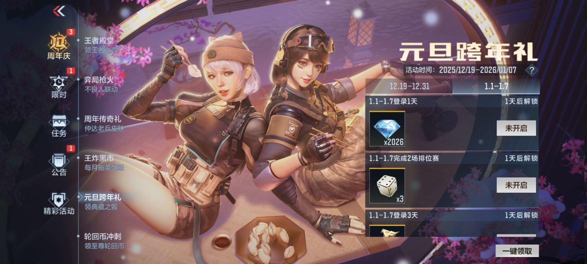元旦跨年礼活动上线有一段时间了,当然,之前可以理解为预热,而1.1-1.7期间才是重头戏。累计登录并完成指定场次排位赛后,一共可领取2026钻石、典藏之骰x3、英雄之钥x3、王者之骰x3。