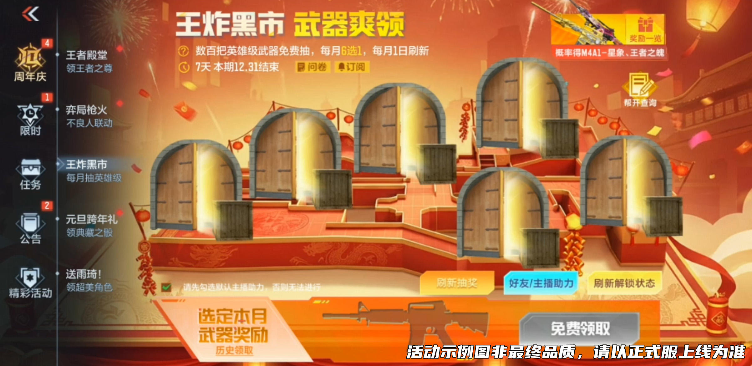 1月的王炸黑市充满特色,玩家完成任务打开6扇门后,在未领武器奖励的情况下,邀请好友助力可获取一次全局刷新的机会,重新抽取6扇门的武器。也就是拥有12次开门机会,开门次数多多惊喜多多,可以来评论区分享你抽到的惊喜武器哦~点击查看活动详情