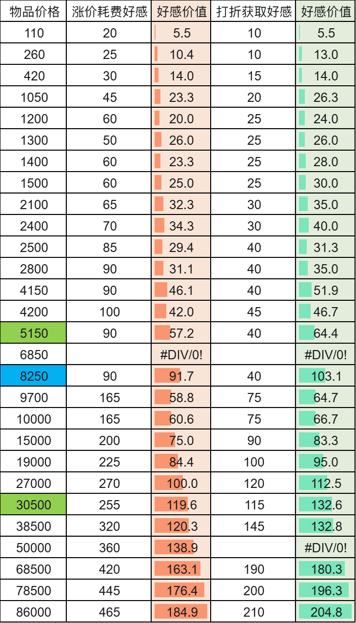 可以看到图片,价格约为5k的商品,价格翻倍需要的好感需要90点,相当于每一点好感等同于57金币,而如果5k的商品折价去赚好感,那么需要40点好感,相当于每点好感卖了64块