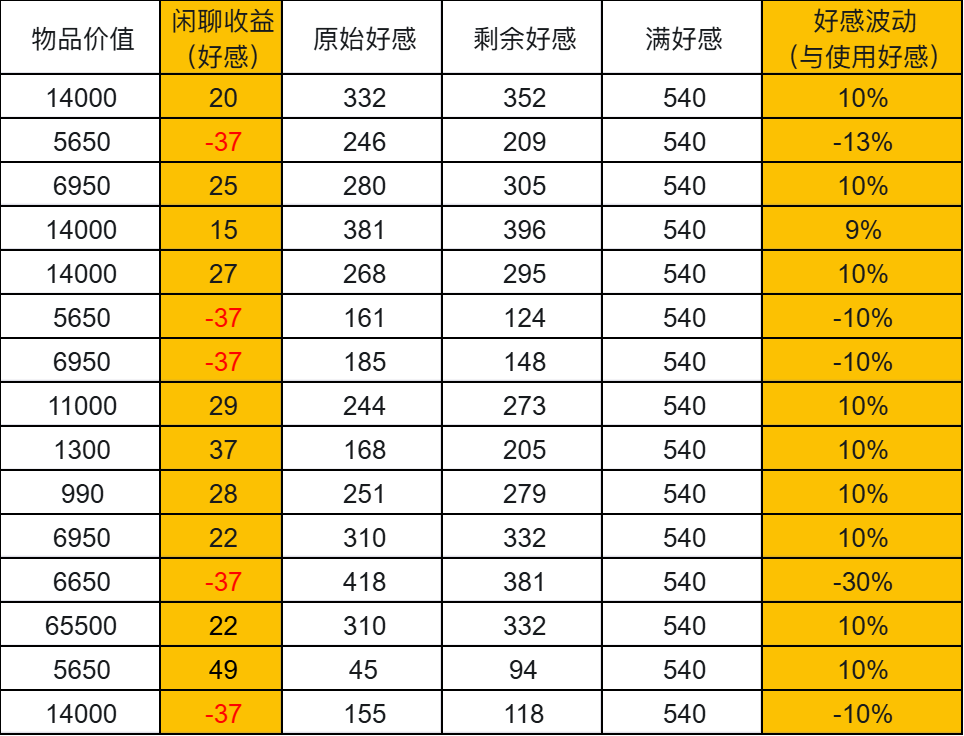 再说下闲聊亏损,闲聊亏损率约为20%,亏损额为定额,不以现在好感剩余值变化,损失额约为总好感值的6.58%,例如我好感满额为540,每次“适得其反”损失好感定额为37点,这个损失也可能与等级挂钩,细节没有做测试,但个人还是更倾向于和满好感值相关性更高