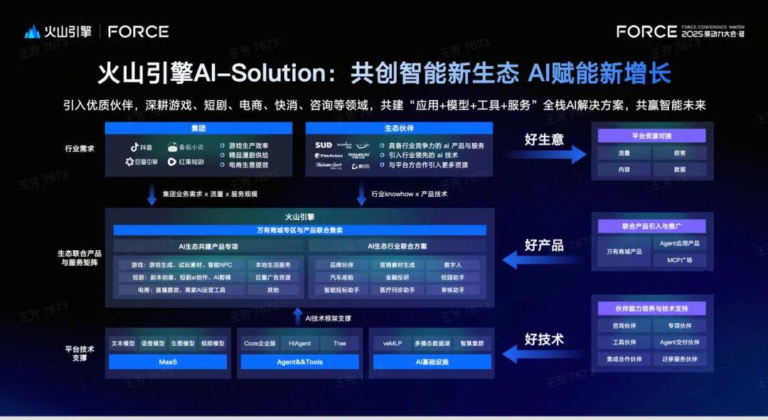 据介绍,火山引擎 AI-Solution 生态方案不仅提供技术能力,还会输出字节跳动多年沉淀的产品方法论与实践经验,帮助合作伙伴少走弯路。方案还会进一步打通抖音电商、抖音小游戏、红果短剧、番茄小说等字节系内部生态资源,为伙伴带来流量、内容等多维权益支持。