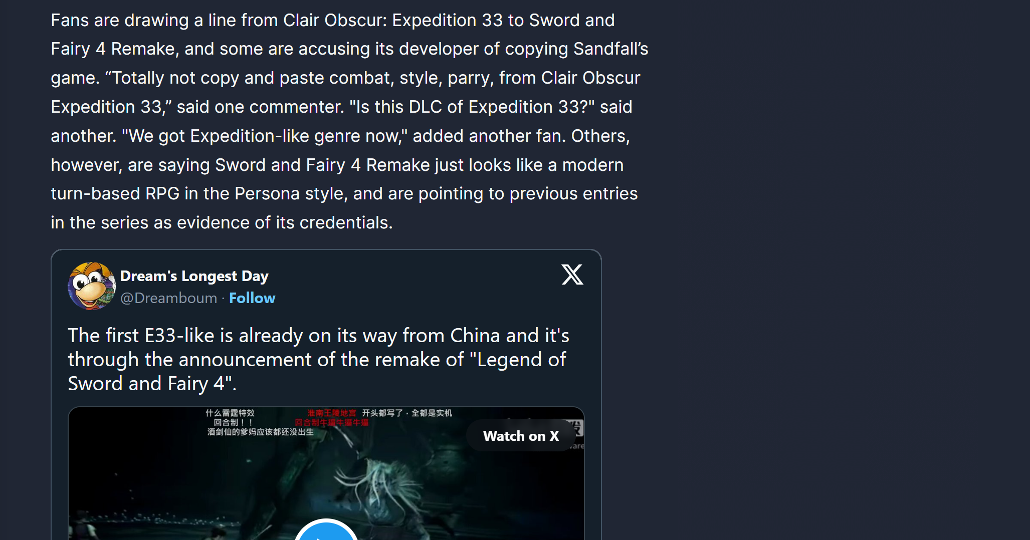 粉丝们将《Clair Obscur: Expedition 33》与《剑与妖精4 重制版》联系起来,一些人指责其开发商抄袭了Sandfall的游戏。“绝对不是从《Clair Obscur Expedition 33》里直接复制粘贴战斗系统、风格和格挡,”一位评论者说道。“这是《Clair Obscur Expedition 33》的DLC吗?”另一位评论者问道。“现在我们有了类似《Clair Obscur Expedition 33》的游戏类型,”另一位粉丝补充道。然而,也有人认为《剑与妖精4 重制版》看起来就像一款现代的、类似《女神异闻录》风格的回合制RPG,并列举了该系列之前的作品来证明其品质。
