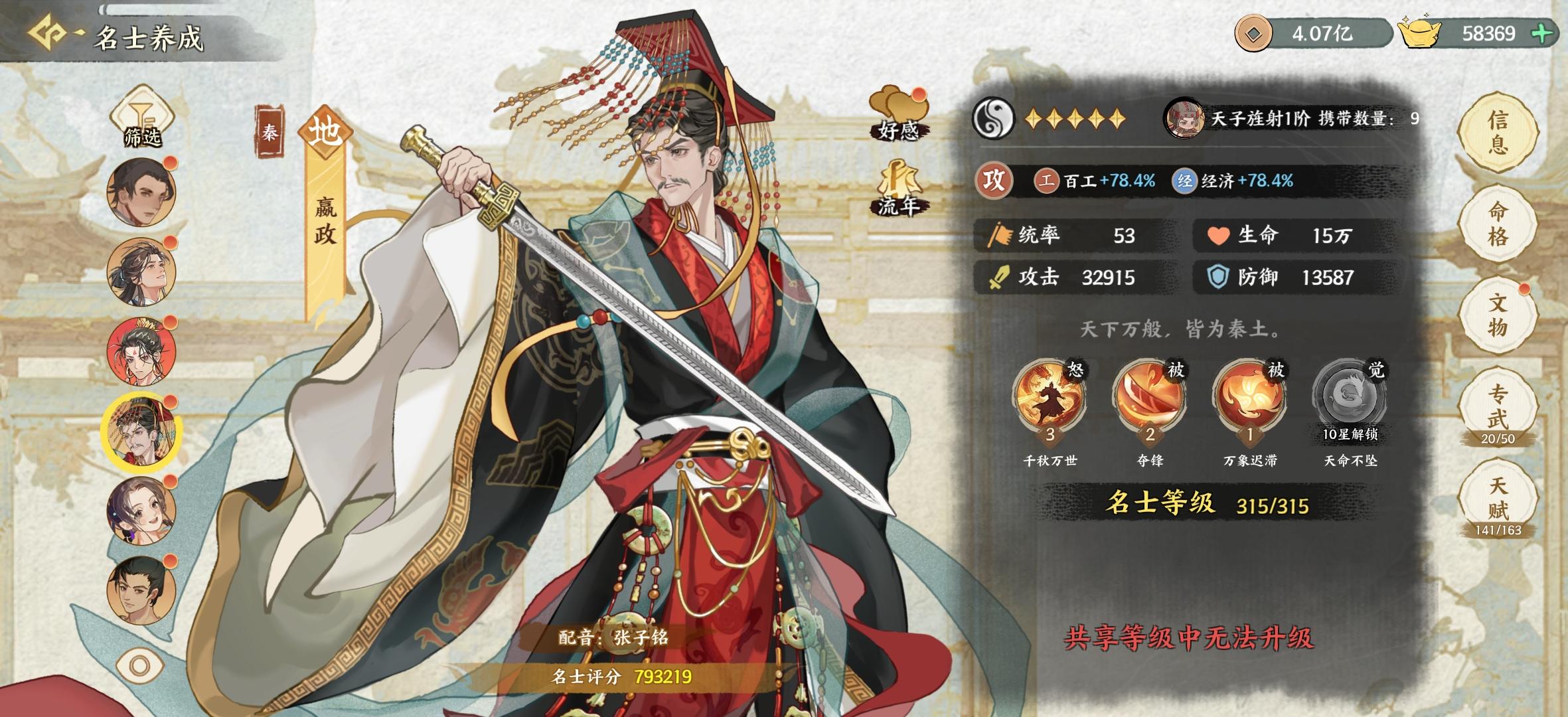 嬴政的技能机制非常强,堪称最强地级名士,减怒减攻击减攻速,对于打pve,pvp来说都比较有用,可惜白嫖最多到五星,不能满星注定不能用到后期。