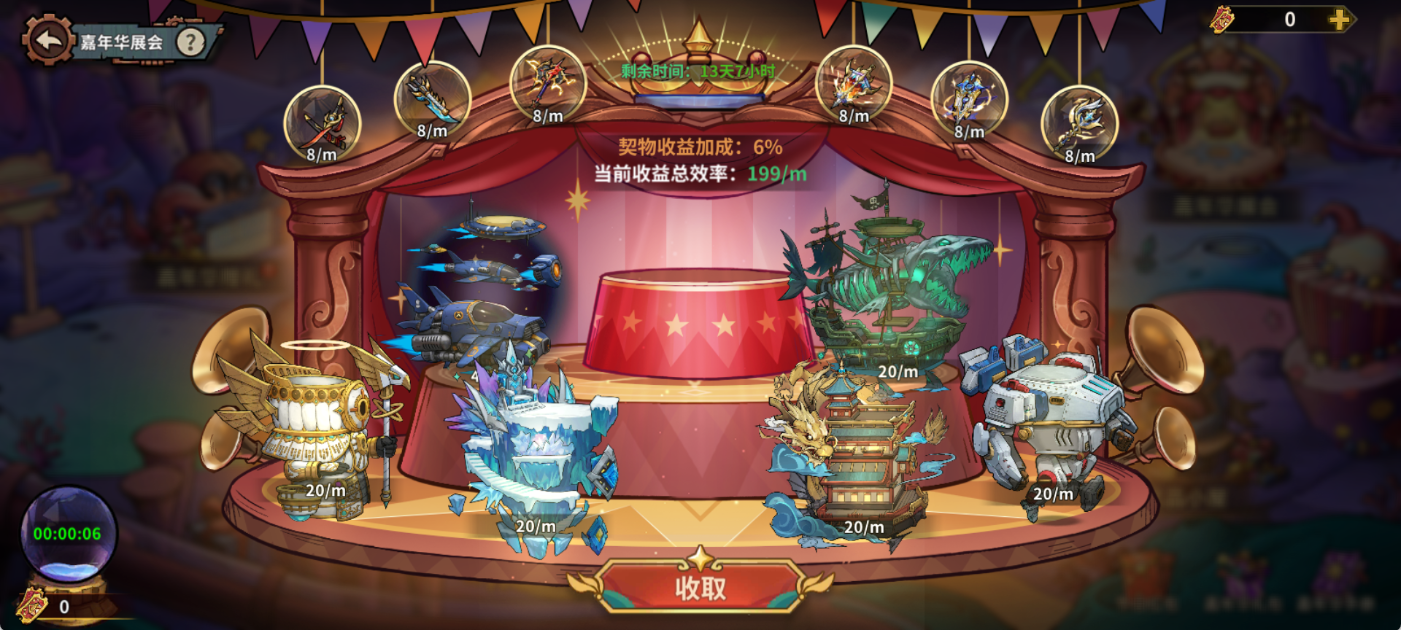 - 嘉年华展会:玩家们可以在界面展示自己收藏的形态和契物,品质及星级越高奖励越丰富,收益随时间累加!越放越多,是获得活动道具「嘉年华兑换券」的主要途径!