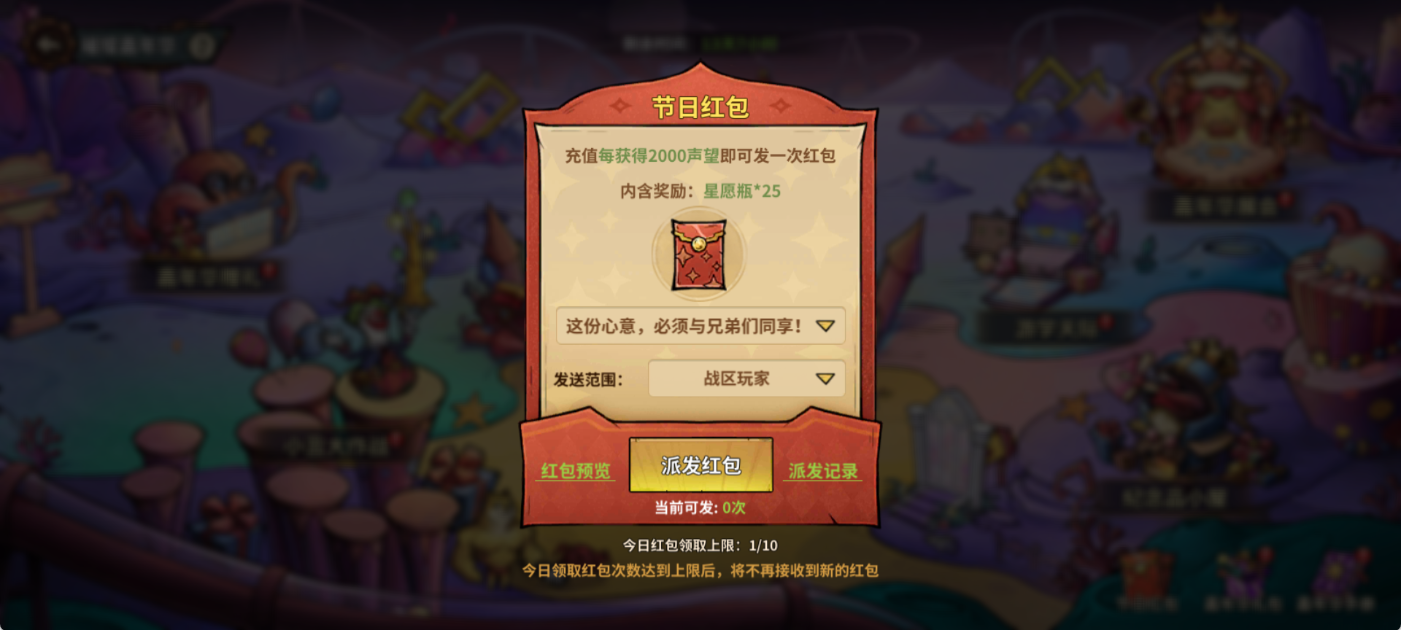 - 节日红包:活动期间,每充值达到2000声望可选择向战区玩家、军团玩家或战区好友发送红包内含「星愿瓶*25」。新年红包拿到手软!