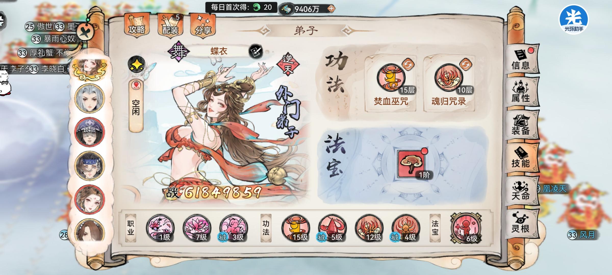 (4)除唐蝶衣以外其他弟子不需要复活功法,因此携带焚血巫咒用来提高一些输出能力。