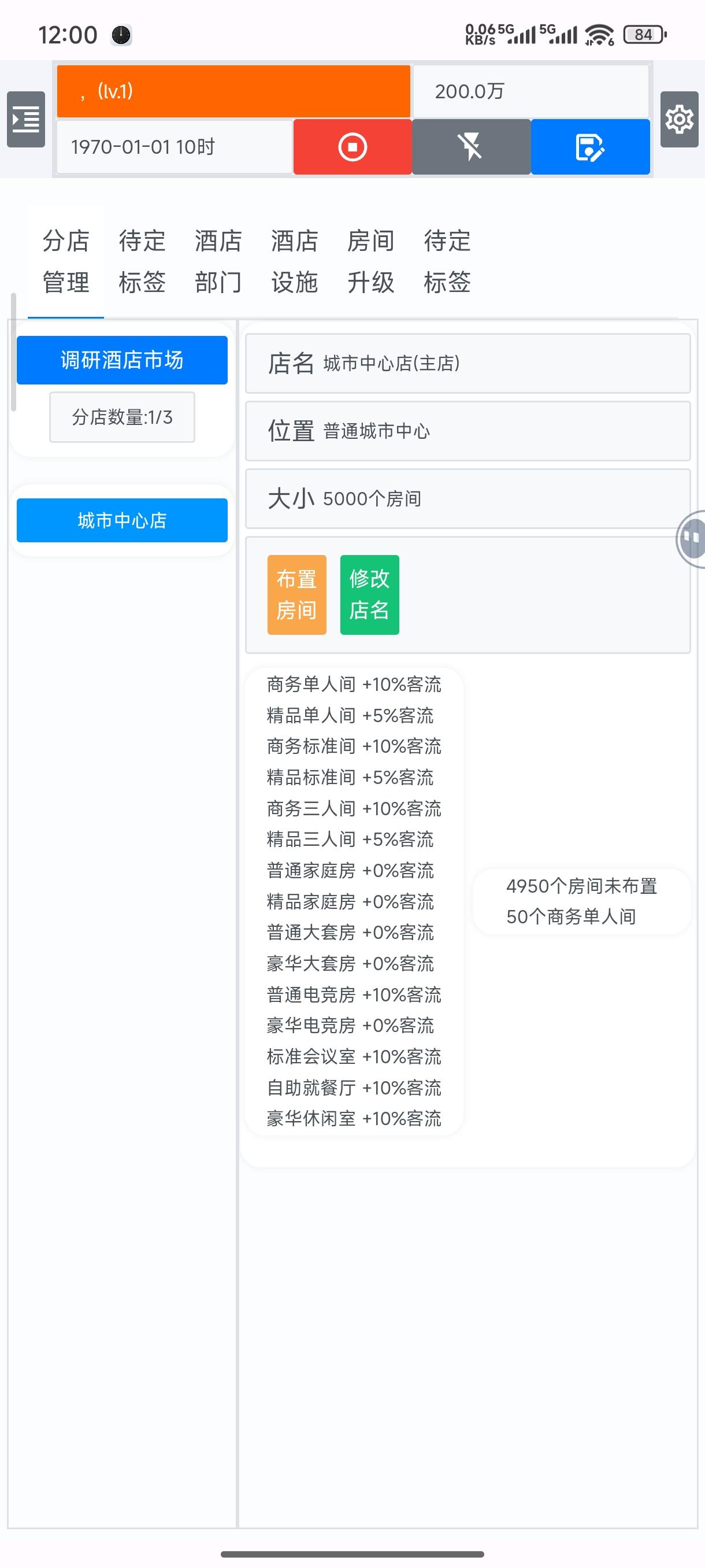 酒店管理界面:点击城市中心店,再点布置房间,就可以增加酒店的各种房间了