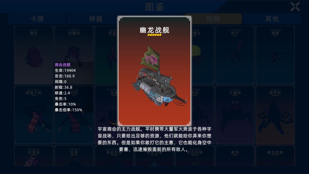 1.新增了打劫宇宙商人的功能。在变异模式和无尽模式中点开宇宙商人的面板,顶部会多出一个打劫按钮,点击后商人的飞船会和你开战,摧毁它会掉落包括一个红神器,两个橙神器在内的巨量各种资源,代价是这一把宇宙商人不再来,并且在每10波的boss关,宇宙商会会派出强大的舰队偷袭你,摧毁这些舰队会掉落少量资源。
