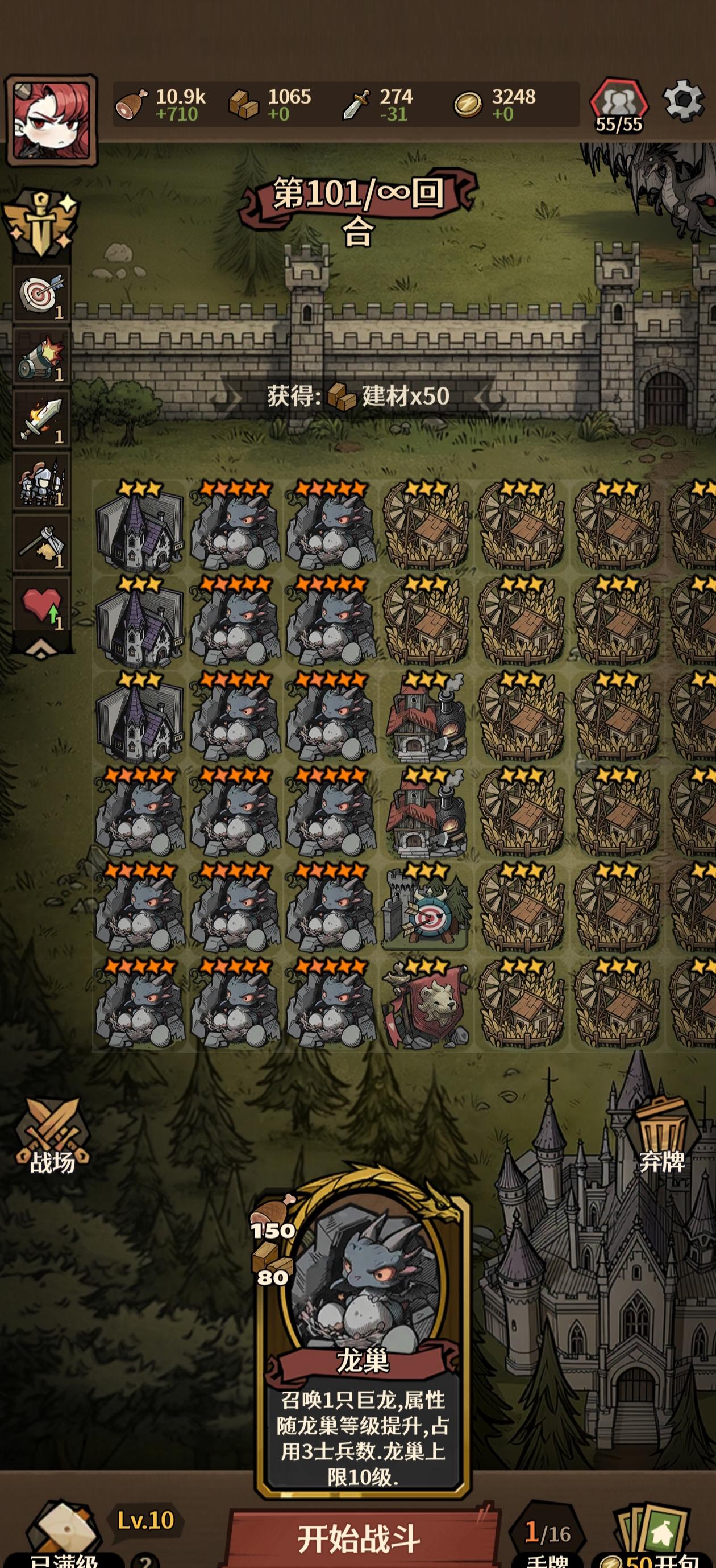 2.无尽模式我们首要的便是长期的资源收入,我们是需要龙进行主力输出,其余只需几个前排泰坦,几个辅助:火炮手对近距离敌人击退,吟游诗人给盾,祭祀加防御(有宝箱天赋的可以清楚负面效果)。因此我们对武器的需求很少,而一个龙巢升满星需8000左右的食物,每回合消耗650的食物。这样的话我们需要规划好三种资源的产出,本人习惯预留三到四列给建材产出,前十回合保证武器够用即可,中期拿6到9个武器产出,其余食物产出种满。