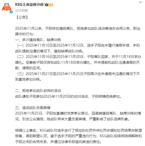 公告显示,2025年11月以来,子阳多次出现擅自离队、缺席训练、拒绝参加战队安排的试训等行为,违反合同义务与职业操守。其直播中的争议言论还引发公众猜测,给战队带来负面舆情。KSG 已将相关处罚依据及结果报备KPL联盟,获得联盟认可。