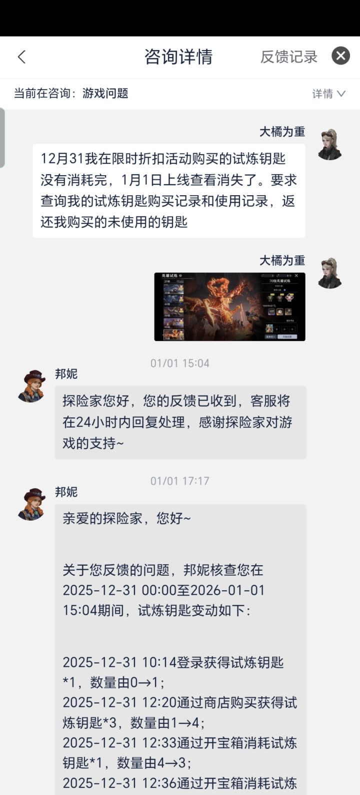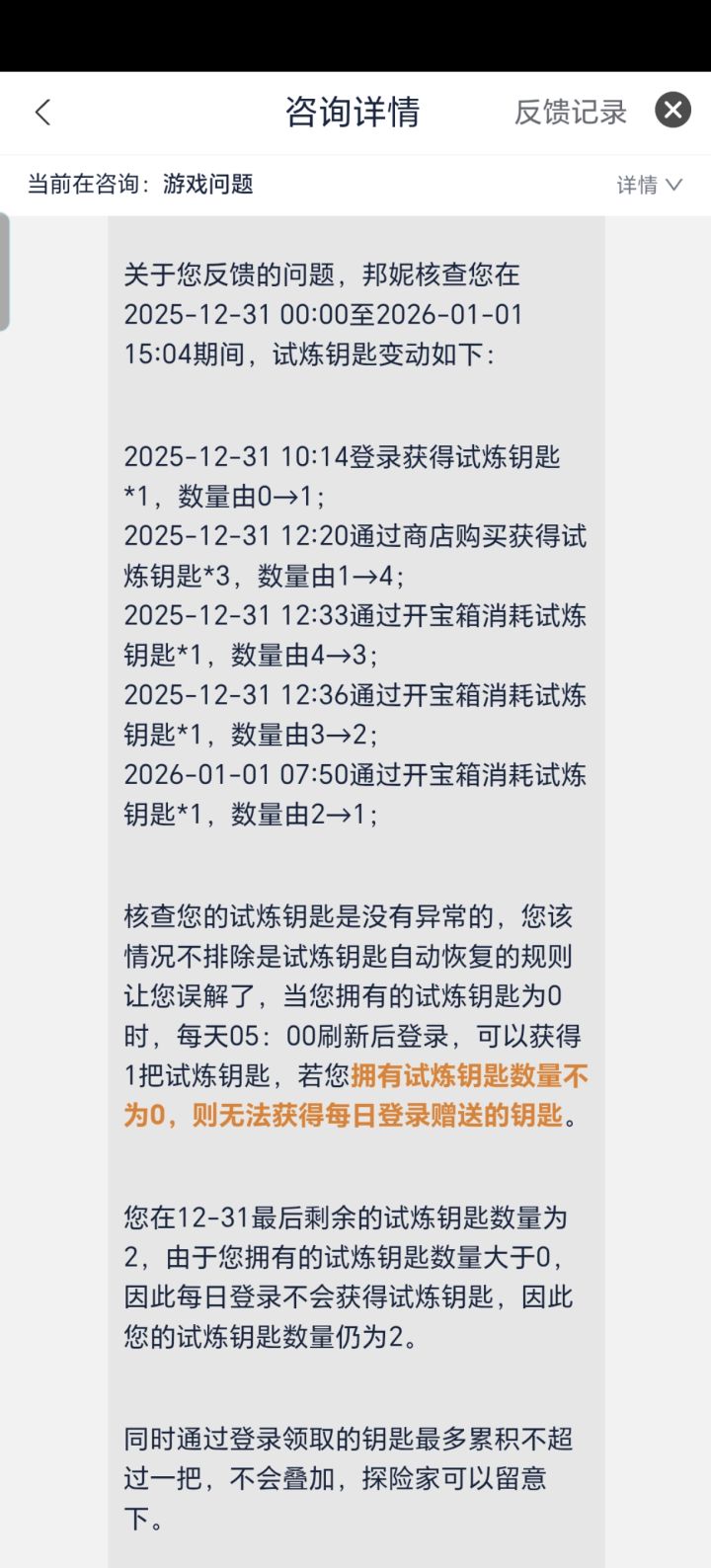 从开服玩到现在,试炼钥匙本身每天送一把,不累计的规则,虽然你不写,但我也是知道的。我31日买了3把钥匙,加上原本的一共4把。然后留了2把没用,1日上线一看,还是2把。每天刷新的一把去哪里了???我自己买的钥匙,怎么就影响每天送的钥匙了?你这规则怎么不写???