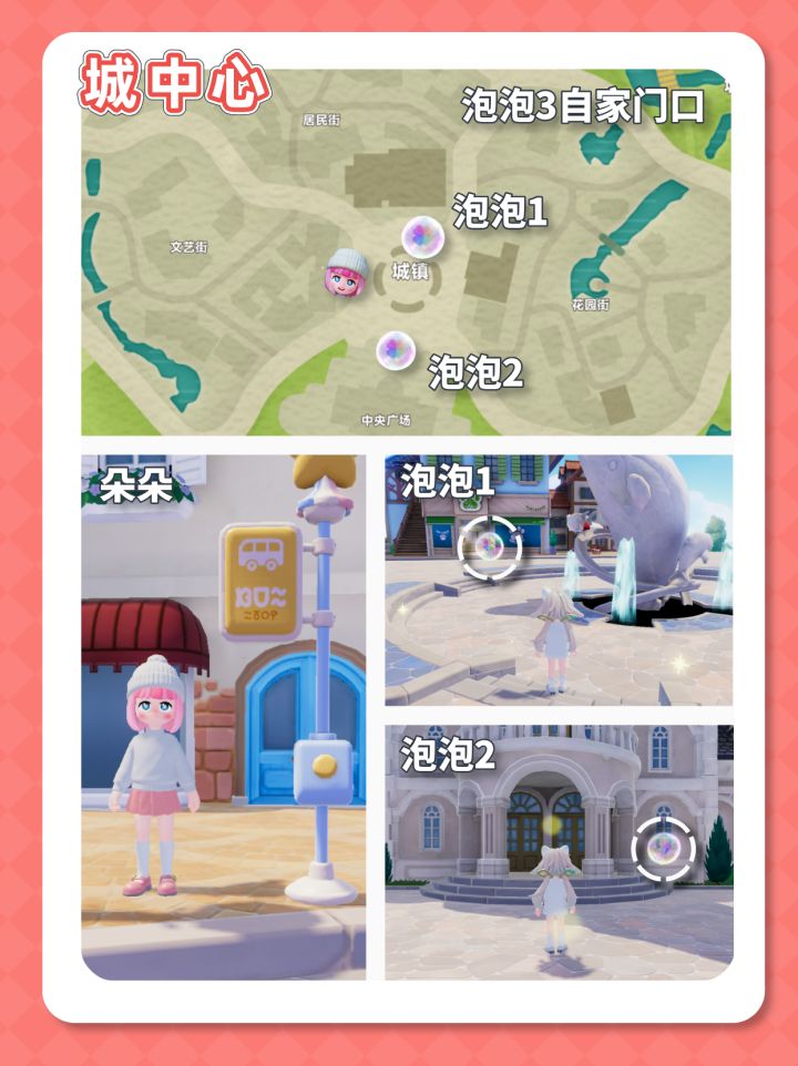 彩虹时间 18~24点 朵朵位置 城中心 泡泡1 鲸鱼喷泉 泡泡2 中心广场 泡泡3 自家门口 必做 1、找朵朵买糖 2、顶彩虹泡泡拿彩虹花束 3、刷鸟虫鱼沙雕图鉴