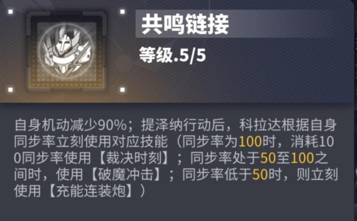 机神科拉达的特性非常独特,机神机动减少90%,意味着正常跑行动条的话机神要等别人跑10轮才能行动一次,因此机神的攻击行为需要提泽纳“行动”才能触发,提泽纳使用2技能、主动使用的普攻或大招、或者触发协击芯片都属于“行动”,然后机神按身上的sp使用技能。