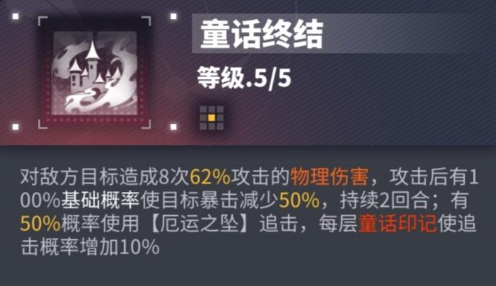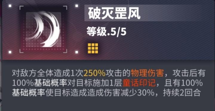 同调后把童话印记的上限翻倍了(低特性的话上限是6或者7层,且数值也低很多),减防量达到600,易伤达到40%,敌方回合开始前受到1200%攻击力的真伤,并且依然保留了灭刃队友大招可以加2500攻的效果。