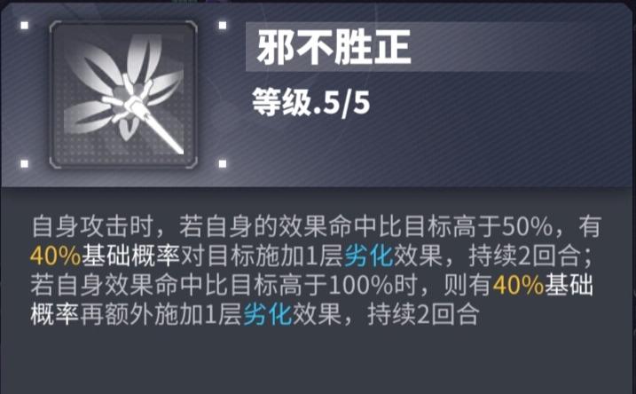 效果命中高于对方一定数值,只要攻击就有概率挂上两层劣化,那么命中哪来呢?答案是满特性