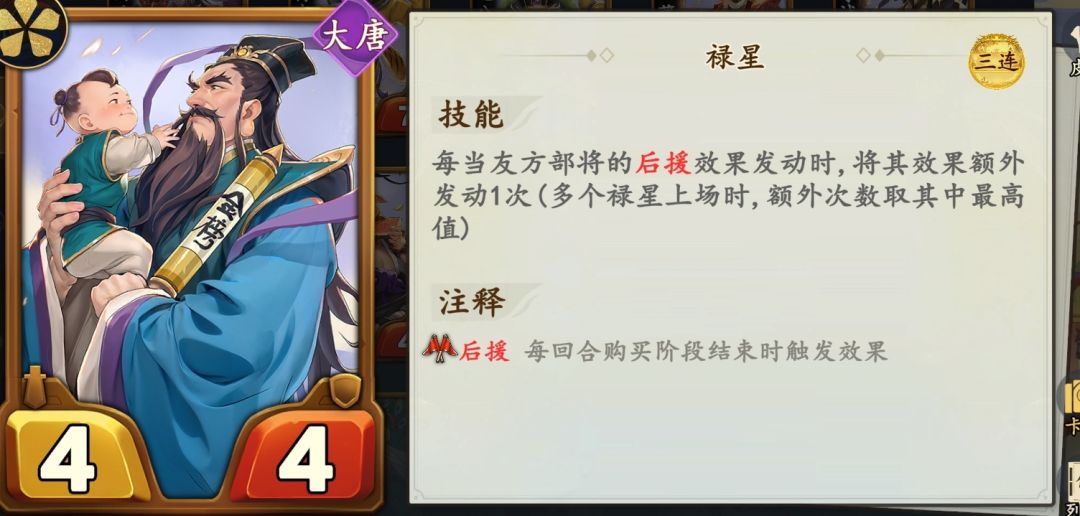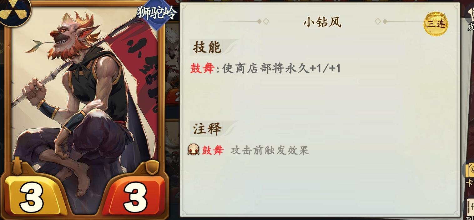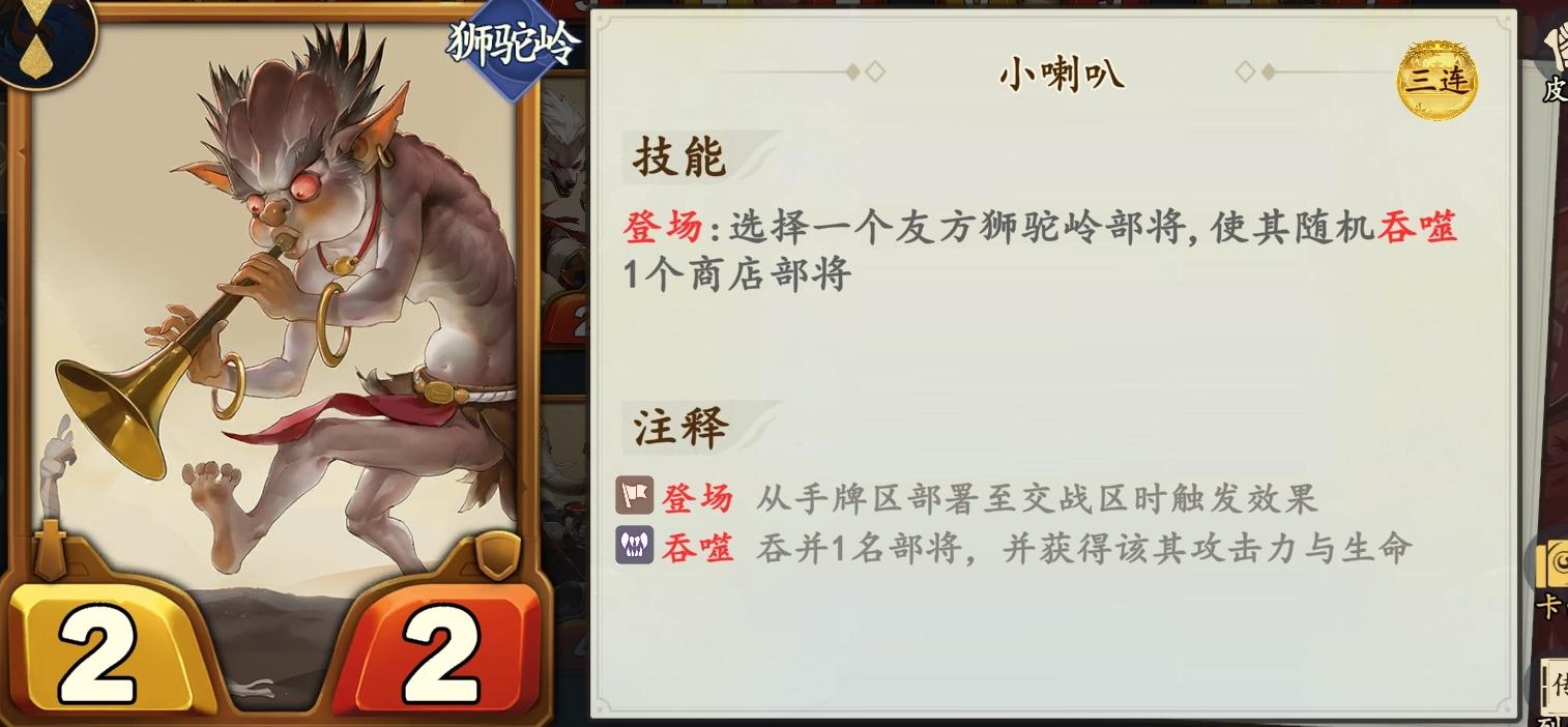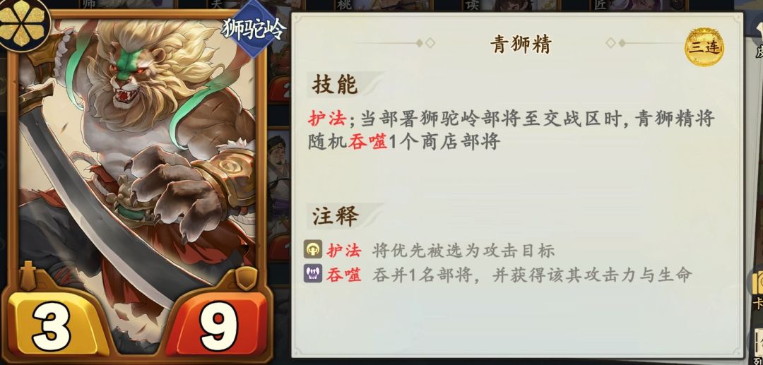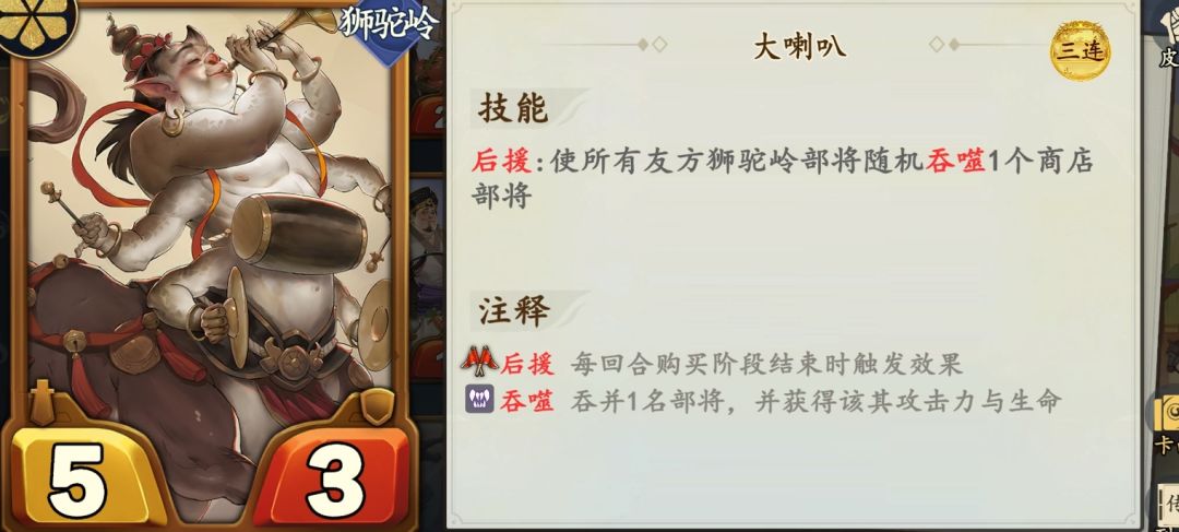 孔雀公主触发后援持续拿狮驼岭手牌,让青狮精吞噬商店属性。大喇叭触发后援让所有部将吞噬商店属性,禄星让后援触发效果翻倍。
