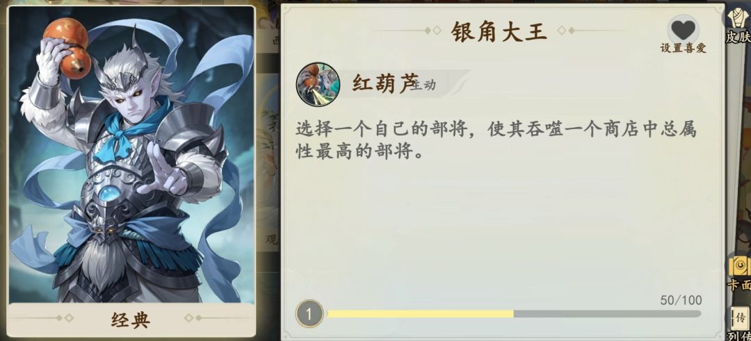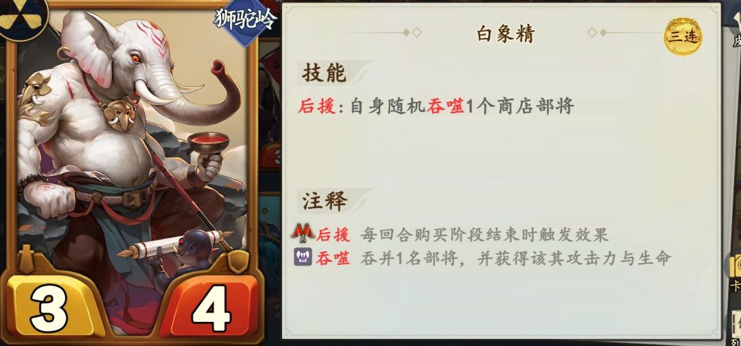 它能让单独一张牌吞噬所有商店属性!!!优先给青狮精、白象精使用,一次加几百上千的属性轻轻松松。成型阵容:白象精、青狮精、大喇叭、孔雀公主、禄星必备,剩余2位置优先青狮精、孔雀公主、白象精。