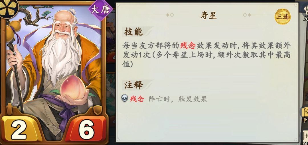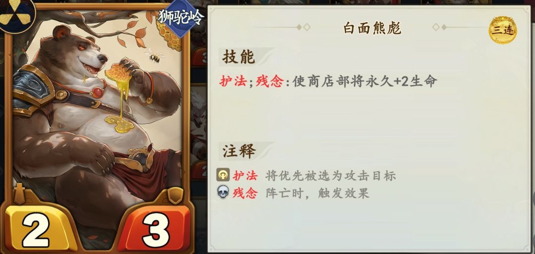 中期推荐:白面熊彪、地藏王菩萨、寿星。白面熊彪残念触发商店生命+2,地藏王菩萨放它右边,能开局多触发一次,配合寿星,残念触发次数翻倍。一回合至少触发商店生命+8。如果都是三连后的,两个白面熊彪,中间地藏王菩萨,一回合最多触发商店生命+36!神通转生给白面熊彪,还能额外增加效果。![[表情_酷]](https://img-tc.tapimg.com/market/images/edd50e702f508971043f5619f686740e.png)