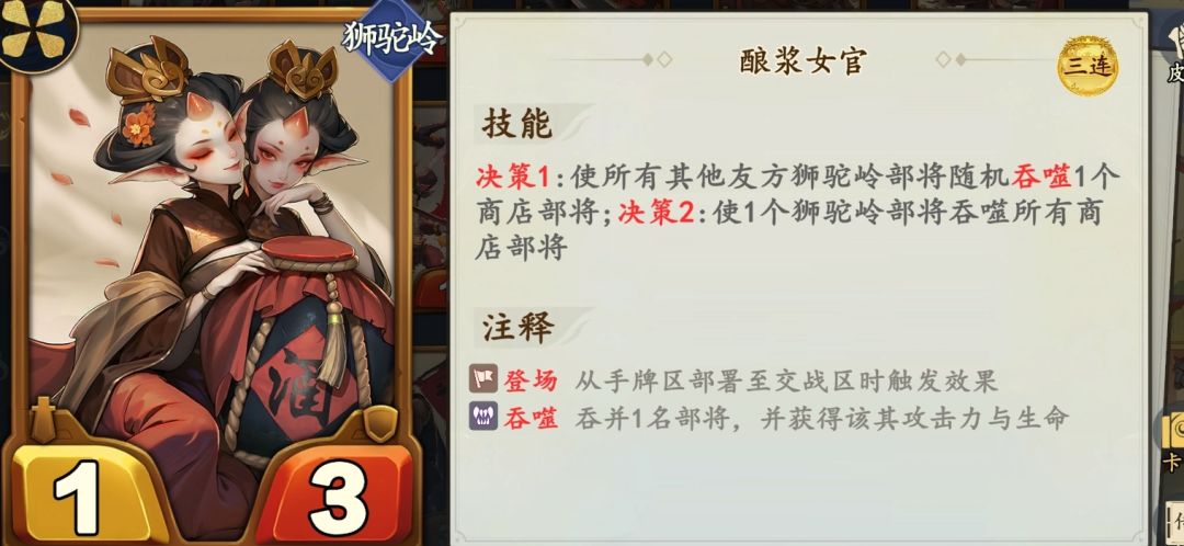 孔雀公主触发后援持续拿狮驼岭手牌,让青狮精吞噬商店属性。大喇叭触发后援让所有部将吞噬商店属性,禄星让后援触发效果翻倍。酿浆女官是神牌!!!