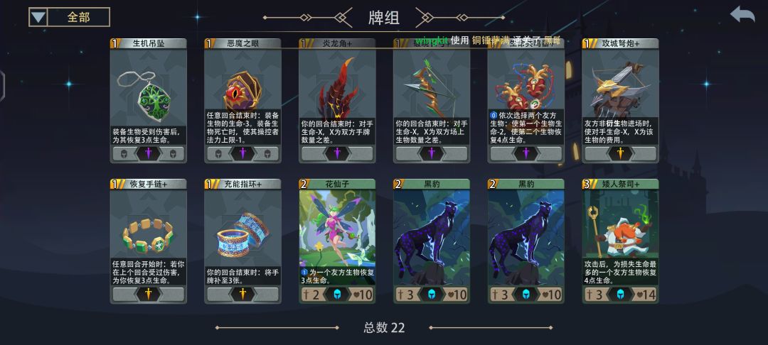 理想卡组:过牌(2~3张)直伤装备(3张)生物装备(1~2张)卡组厚度(20~22张)