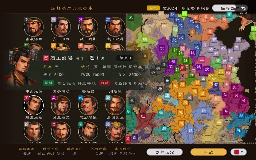 这次开放的存档是以周王为主视角进行的,个人觉得难度相当的大。【如果想玩其他势力,现在不是开放了转势力嘛,直接转势力过去就可以,还是直接满钱满粮的!!